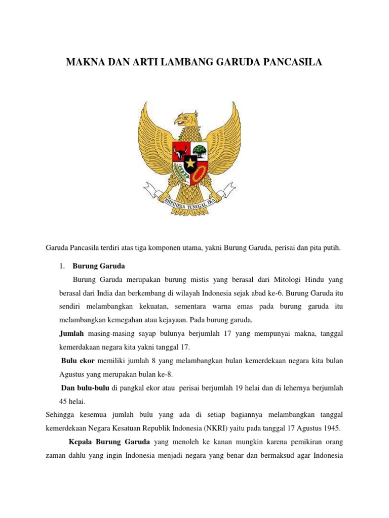 ARTI DARI JUMLAH BULU PADA BURUNG GARUDA. Burung Garuda merupakan burung mistis yang berasal dari Mitologi Hindu yang berasal dari India dan berkembang di wilayah Indonesia sejak abad ke-6. Garuda pancasila adalah burung yang dikenal sebagai simbol negara untuk menggambarkan Negara Indonesia merupakan bangsa yang kuat besar dan disegani tidak diremehkan.