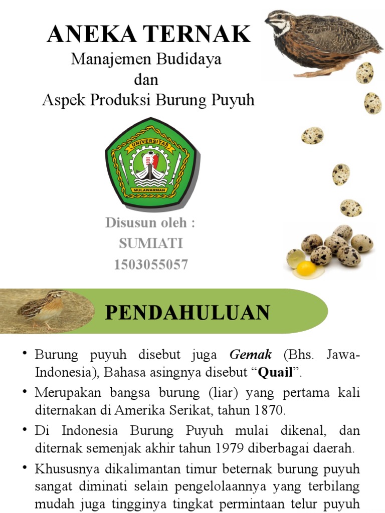 Burung puyuh akan mulai bertelur pada umur 6 minggu dan puncak produksinya pada umur 11 - 14 minggu. DJION PUYUH MAKASSAR Skripsi Diajukan sebagai Salah Satu Syarat Maraih Gelar Sarjan Peternakan SPt pada Jurusan Ilmu Peternakan Fakultas Sains dan Teknologi Universitas Islam Negeri Alauddin Makassar. Burung puyuh juga mulai dikenal dan diternakkan di Indonesia pada akhir tahun 1979 yakni di Sumatera Jawa Barat Jawa Timur dan Jawa Tengah H ines 2005.