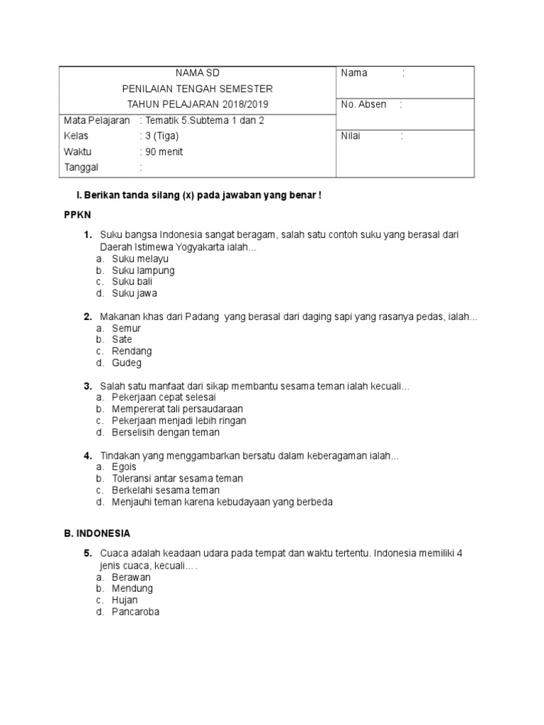 Soal Jawaban PTS Kelas 3 Tema 5 Subtema 1 2 Semester Genap 20202021 Written By Sinau Thewe. Berikan tanda silang x pada jawaban yang benar. Gerakan kepala yang harus dilakukan saat pertama menirukan burung kutilang adalah.